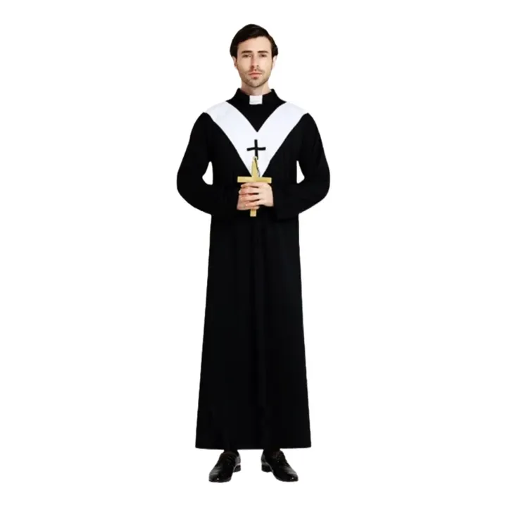 ชุดบาทหลวงเป็นอีกหนึ่งชุดที่น่าสนใจสำหรับหนุ่มๆ ในปาร์ตี้วันฮาโลวีนที่จะถึงนี้ ชุดมาในสไตล์ของบาทหลวงคลาสสิก พร้อมด้วยไม้กางเขนสำหรับปราบผี ตัวชุดตัดเย็บจากวัสดุผ้ายืดช่วยให้รองรับรอบอกสูงสุดมากถึง 48 นิ้ว เหมาะกับผู้ที่มีส่วนสูงตั้งแต่ 165-185 ซม.