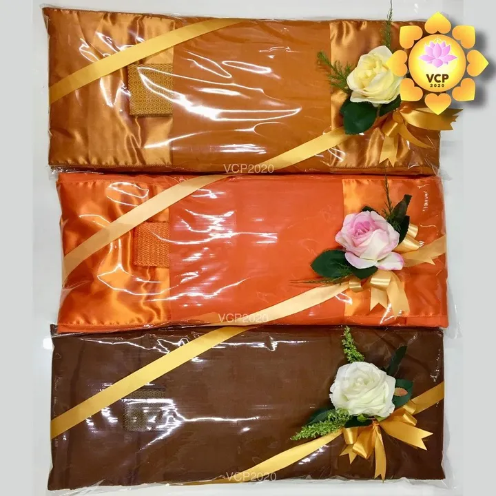 ชุดผ้าไตรจีวร 7 ชิ้น ตัดเย็บจากผ้าโทเร ประกอบไปด้วยผ้า 7 ชิ้น คือ ผ้ารัดอก, รัดประคดเอว, ผ้ากราบ, อังสะ, สบง, จีวร และสังฆาฏิ หน้าผ้าขนาด 1.9-2.0 เมตร มาในเซตพร้อมผูกโบว์และตกแต่งด้วยดอกไม้สวยงามพร้อมถวายในงานพิธี มีให้เลือก 3 สี คือ สีเหลืองทอง สีแก่นบวร และสีพระราชทาน